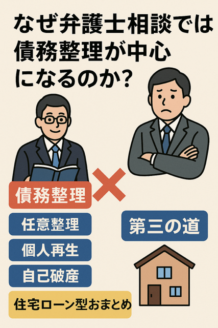 多重債務に悩んだとき、最初に駆け込む先は弁護士という方が多いでしょう。ところが実際に相談してみると、提示される選択肢は「任意整理」「個人再生」「自己破産」といった法的整理のみです。なぜ住宅ローン型おまとめのような方法は出てこないのでしょうか?本稿ではその理由を分かりやすく解説し、さらに第三の道として住宅ローン型おまとめの可能性を示します。