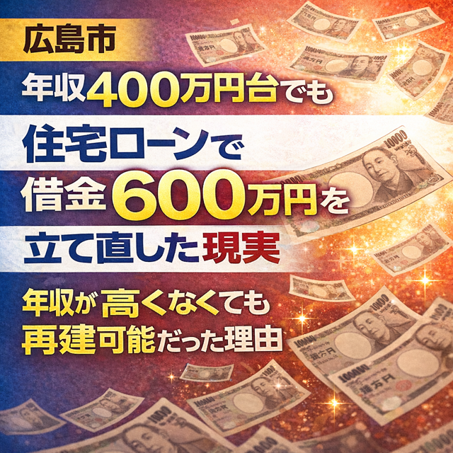 「年収が低いから無理だと思っていた」 「住宅ローンがある時点で、これ以上借りられないはず」 広島市で多重債務に悩む人の多くが、 年収を理由に最初から諦めています。 しかし実際には、 年収が高くなくても“通る人”は通っています。 今回は、年収400万円台でも 住宅ローン型おまとめ借り換えで再建できた実話です。